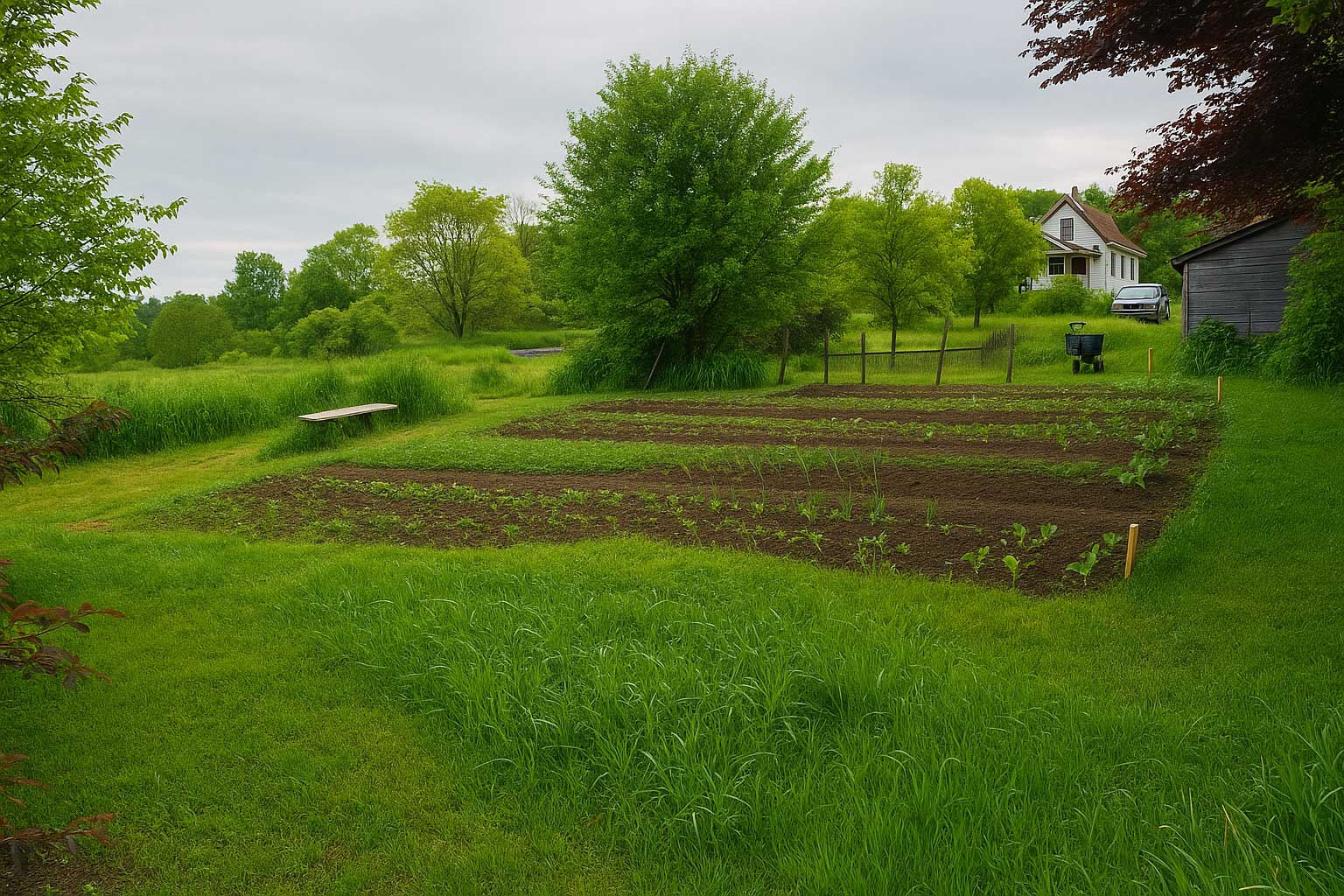 The pasture is grazed by farm animals. There may be goats, sheep and cows grazing on lazy afternoon. A pole barn was built in 2025 for the two bulls visiting for the season.